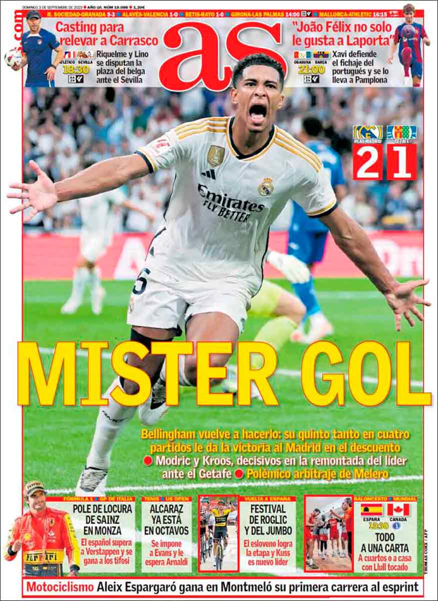 Diario As se centra en Míster Gol, como califica con acierto a Bellingham. Y tilda de polémico el arbitraje de Melero. Nosotros nos remitimos a las palabras de Alberto Cosín en su crónica arbitral: «Melero es uno de los colegiados con menos nivel de la categoría y eso que el listón ya está abajo. Hoy volvió a evidenciarlo errando mucho más que acertando. No dominó el partido porque le falta temple, decisión, categoría y sobre todo calidad».