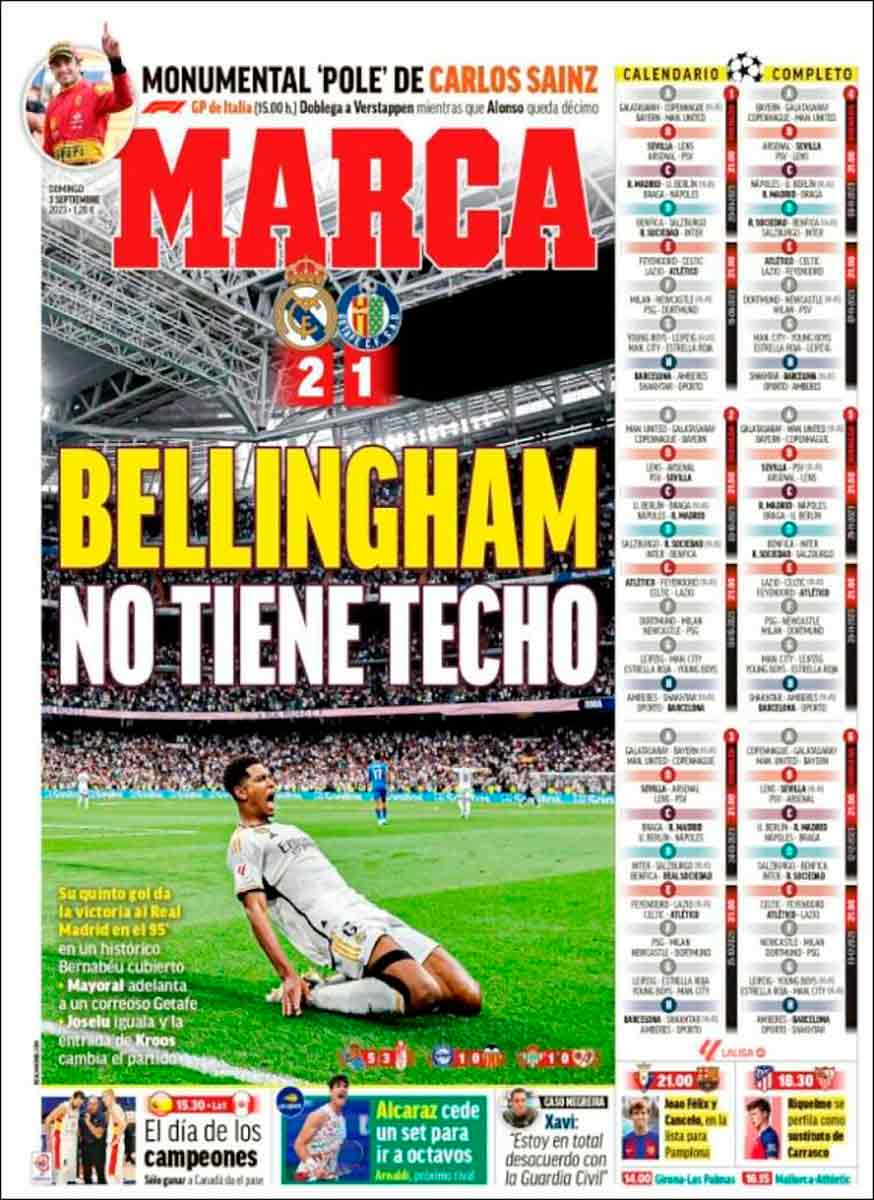 Cuando una portada es excelente se dice y no pasa nada. Es el caso de la de Marca de hoy. “Bellingham no tiene techo” titula el diario de Gallardo sobre una soberbia fotografía del inglés en actitud torera celebrando su gol bajo el cielo cubierto del Santiago Bernabéu.