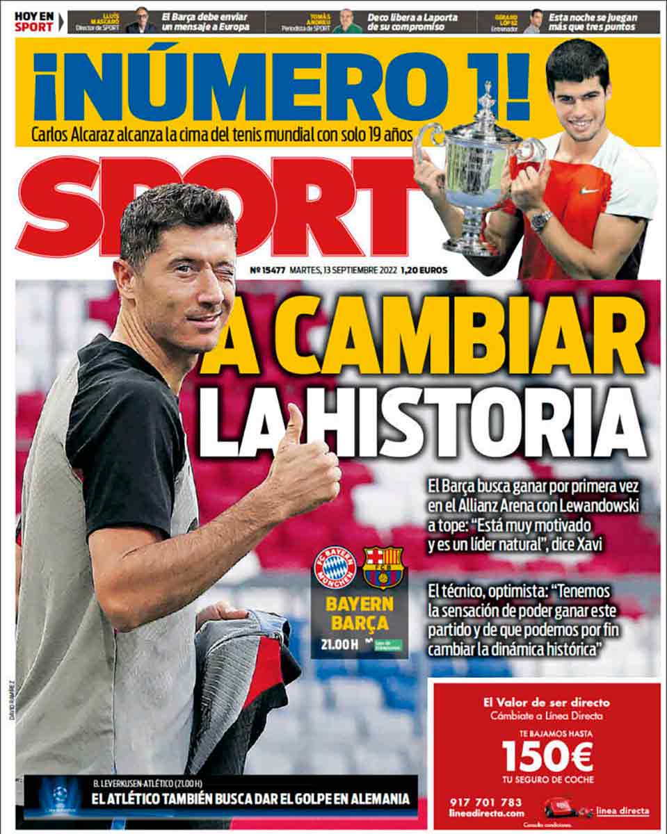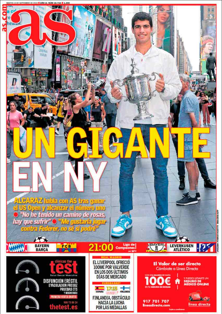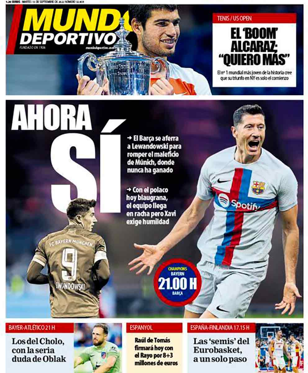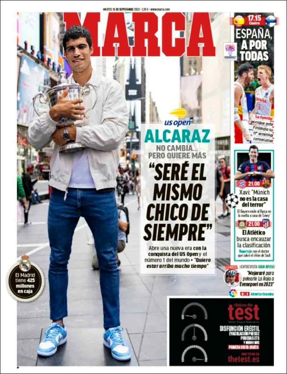 Tanto As como Marca dedican sus portadas a Carlos Alcaraz, que lo merece, sin duda. Número uno más joven de la historia y un potencial que asusta. De él sí se puede afirmar que ahora mismo es el mejor del mundo, porque hay un dato oficial que lo respada (¿entiendes, Xavi?).