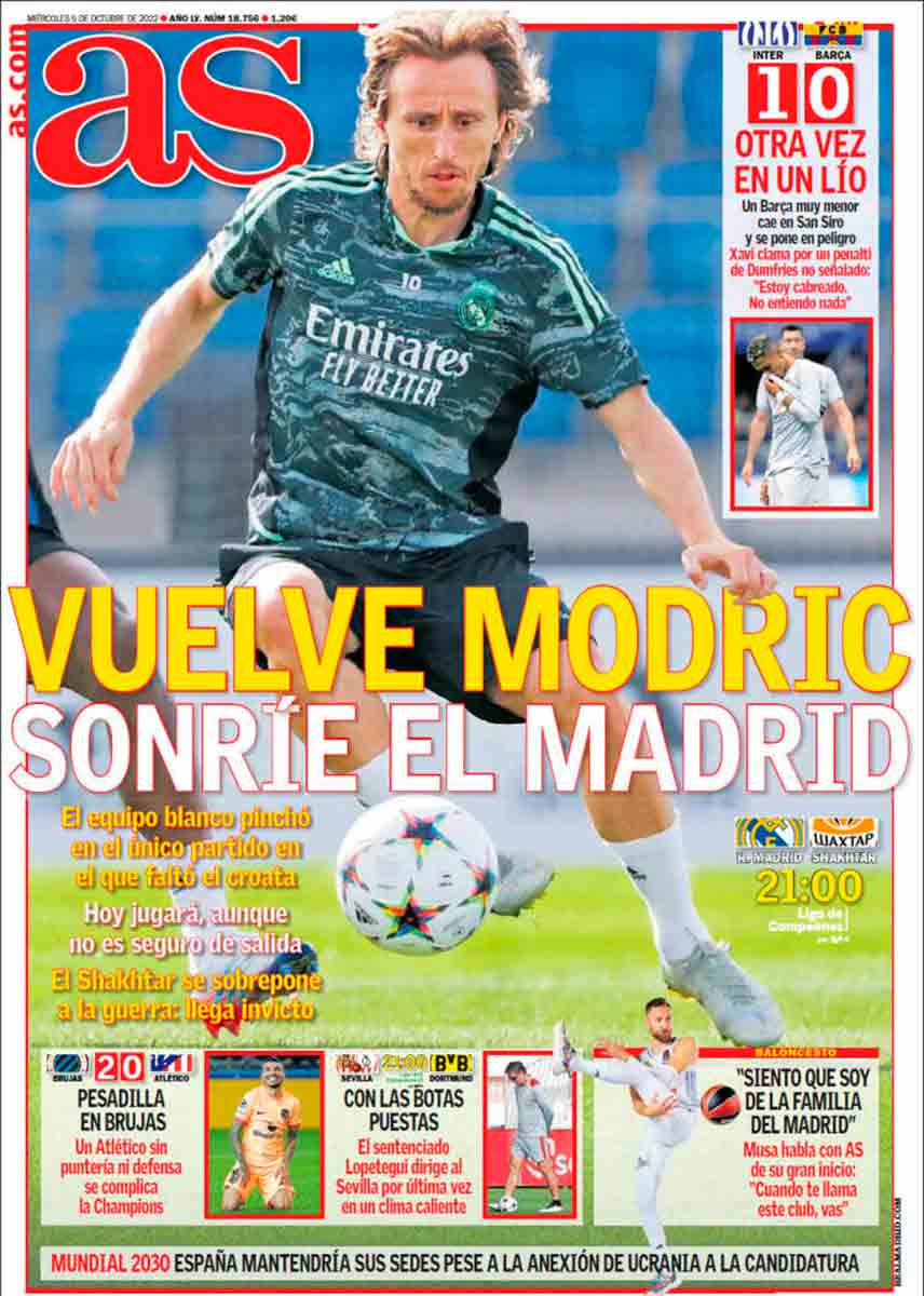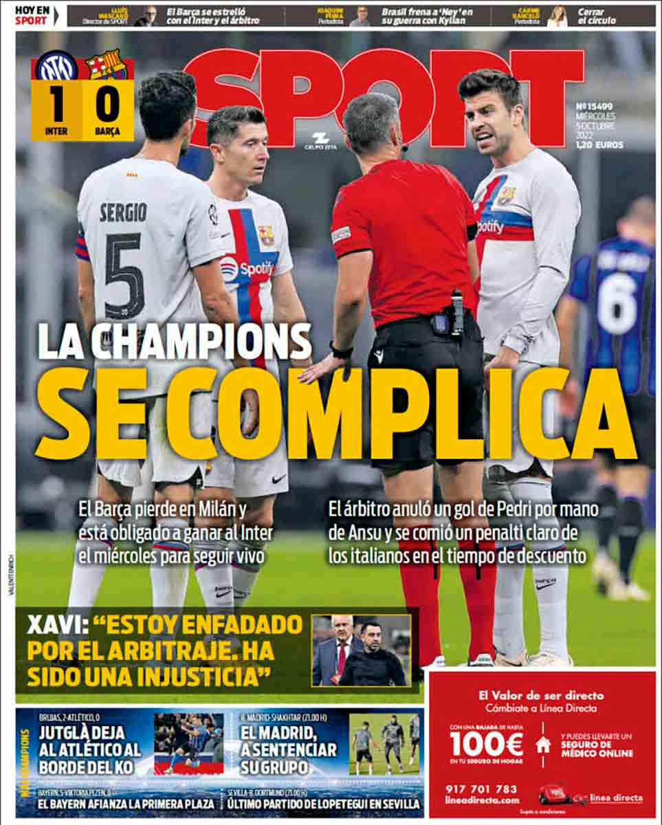 Arriba consigna Marca el doble vapuleo a Barça y Atleti, que quedan de este modo heridos de distinta gravedad de cara a la superación de la fase de grupos. El Atleti perdió contra el Brujas con una asistencia y un gol de Jutglà, delantero al que no estaría mal tener en el radar a pesar de que Luis Enrique seguro que lo tiene también. Por su parte, el Barça perdió 1-0 contra el Inter. Jugaron fatal, pero esto no es lo que preocupa a los guardianes de las esencias del juego, no. Lo que les preocupa, lo que centra sus explicaciones iracundas en torno a la derrota, es otro factor.