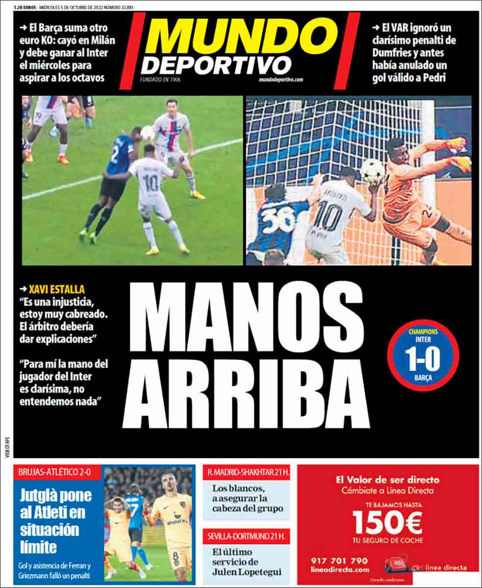 “Manos arriba”, titula Mundo Deportivo. Esto tampoco debe entenderse como una queja colérica. Esta gente, como Xavi, no se queja jamás. Simplemente, es el primer paso de una variante catalana de la yenka, no penséis mal.