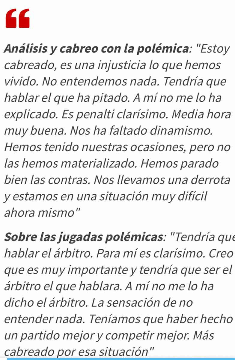 A ver. No vayamos a malinterpretar. Cuando Xavi dice que “Es una injusticia” y que “Tendría que hablar el árbitro”, en relación a un hipotético penalti, no está hablando del árbitro. Solo dice que este último tendría que hablar, lo cual no supone hablar de él. Hasta tal punto NO habla Xavi del árbitro que le invita a hablar a él. No hagáis pues caso de las primeras impresiones. Ninguna contradicción entre la primera captura y la segunda, ni el menor asomo de hipocresía, ni el más leve atisbo de impostura.