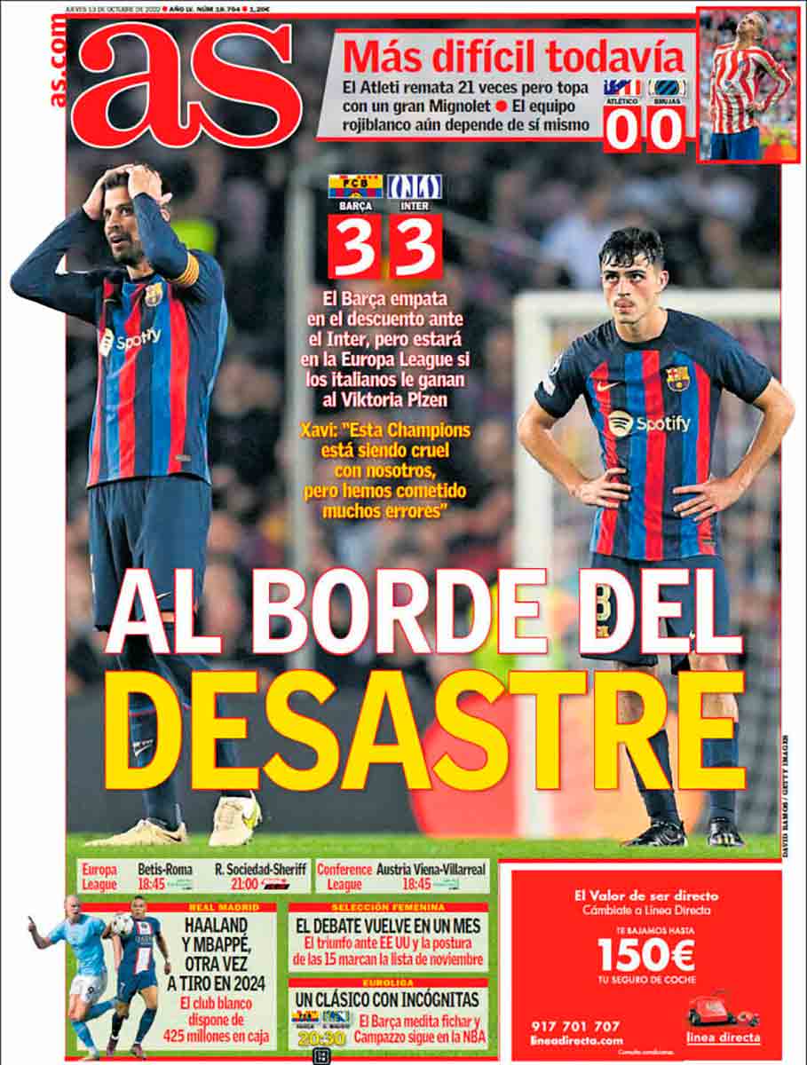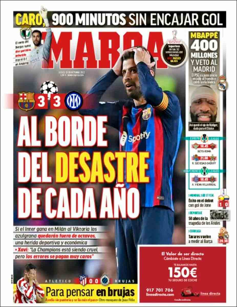 Los diarios madrileños se centran en el show circense vivido ayer en el Camp Nou. For the benefit of Mr. Kite there will be a show tonight. La portada de As recoge a Pedri y a un Piqué que se lleva las manos a la cabeza como pensando: ¿habré especificado bien en el contrato que firmé con Rubi cómo repartirnos las comisiones? La portada de Marca hace zoom a la de AS y se queda solo con el tipo que no tiene frío siempre, protagonista del primer gol del Inter, donde posó al modo del borracho que espeta: "yo controlo", y luego pasa lo que pasa.