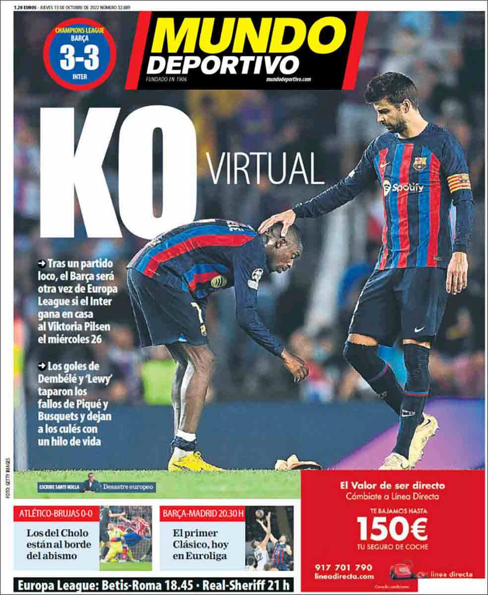 La prensa culé enfoca la catástrofe azulgrana desde puntos de vista diferentes, Mundo Deportivo es más realista y titula “KO virtual”, virtual como las cuentas culés, virtual como el relato del Barça, virtual como los castillos en el aire que proyectan. A Sport le cuesta asumir la realidad y esboza un “Vivos de milagro”. Envidiamos su capacidad para ver el lado “bueno” de las cosas.