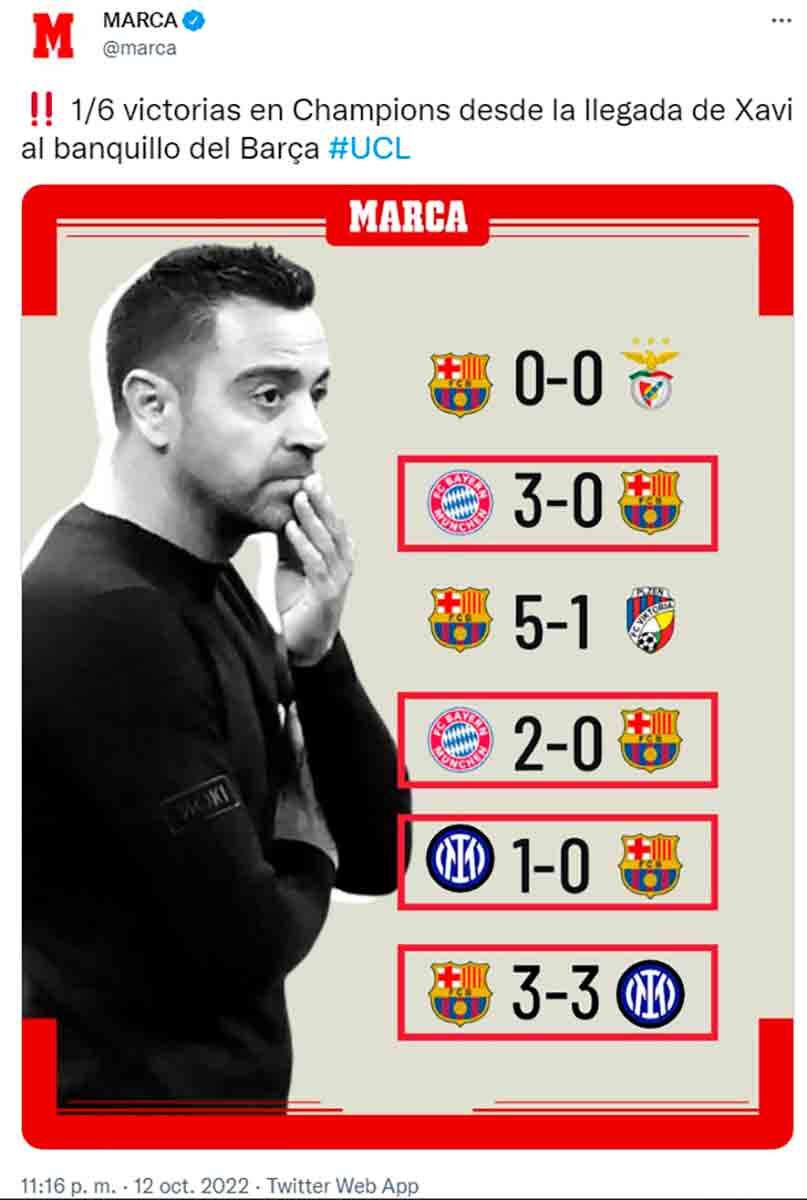 Buenos días, amigos. Xavi supera a Zidane. Sí, no os extrañéis, es la pura verdad. Hace unos días comenzó a leerse en medios culés esta afirmación, también vimos por capturas de tuits que el tal Jota Jordi ese dijo algo del asunto en la carpa donde trabaja. La verdad es que no le dimos mucha importancia, pero tras el empate milagroso del Barça ayer, ese empate glorioso que permite aplazar la eliminación de Champions una semana más y con ello prolongar la ansiedad y la angustia, tras el empate milagroso de ayer, decíamos, Marca publicó esta infografía esclarecedora.