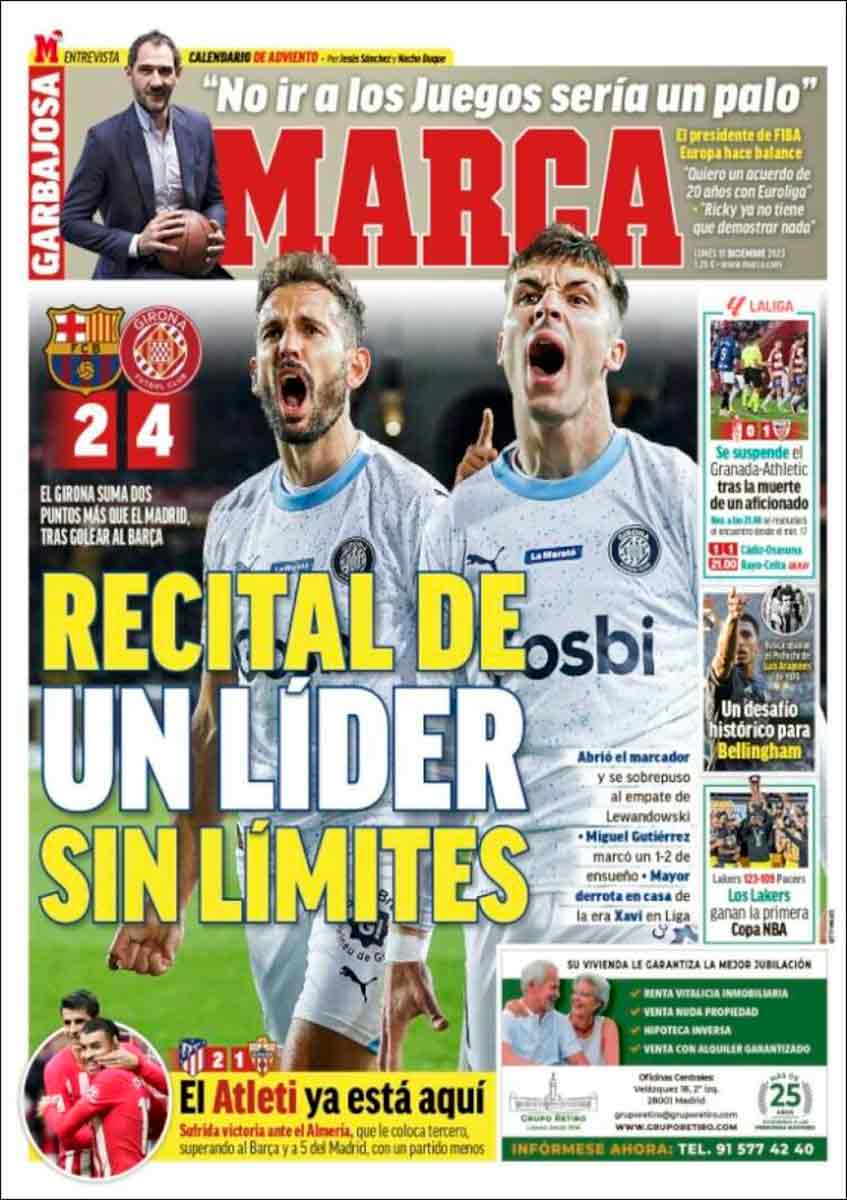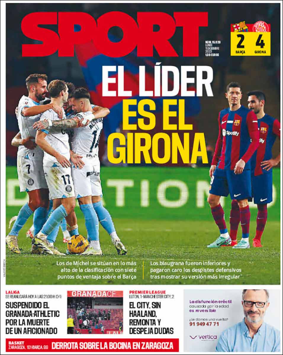 Nos hace gracia, por lo demás, el comentario en letra pequeña, referente al Girona: “Saca dos puntos al Madrid y 7 a un irregular Barça, ahora cuarto, que peleó con tantos de Lewy y Gündogan”. Es maravilloso, no nos digáis que no. El Barça “PELEÓ”, se nos comunica, como si hubiera que aplaudir el esfuerzo de un modesto velero (el Barça, se conoce) en la batalla naval ante un portaaviones como el Girona. Las interesantísimas concomitancias freudianas en el hecho de que al Madrid le saque el Girona dos puntos (con letra) mientras al Barça le saca 7 (con número) las ponemos en manos de algún psicoanalista que haya en la sala.