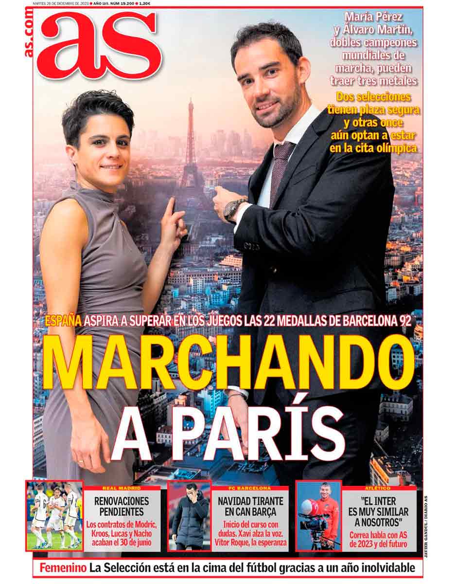 La primera plana de As tiene el mismo interés para el aficionado del Madrid que observar cómo se elimina, por medios manuales, el gotelé de los paramentos verticales de una vivienda de San Cristóbal de los Ángeles un martes con luna en cuarto menguante. Álvaro Martín y María Pérez, campeones mundiales de marcha, posan frente a un póster de París mientras señalan la torre Eiffel a lo Laudrup. Viene a cuento porque, por lo visto, el año que viene se celebran otros juegos olímpicos en esa ciudad. A nosotros la verdad es que por París lo que nos viene a la cabeza son Champions del Madrid, pero cada uno lleva la marcha que quiere y puede.