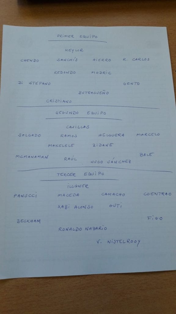 Tres onces sentimentales y estéticos que tienen que ver con el tiempo y el viento y el olor. Y con los veranos y con los inviernos. Y con los aspectos técnicos más bien como yo hago cábalas en lugar de cálculos. Y son tres onces intercambiables. Seguro que alguno de ustedes piensa (y yo también) qué hace Zizú (a quien pongo de entrenador del primer equipo, a Mourinho del segundo y a Carletto del tercero) en el segundo equipo, como Raúl, o Ronaldo Nazario en el tercero, o por qué figura Beckham entre los elegidos, y yo no sabría responderles del mismo modo que no sabría responderles si es mejor película Centauros del desierto o Candilejas, o mejor canción Help que Satisfaction, o mejor libro Fiesta que Santuario. Pero tampoco importa tanto. Estamos hablando del Madrid.