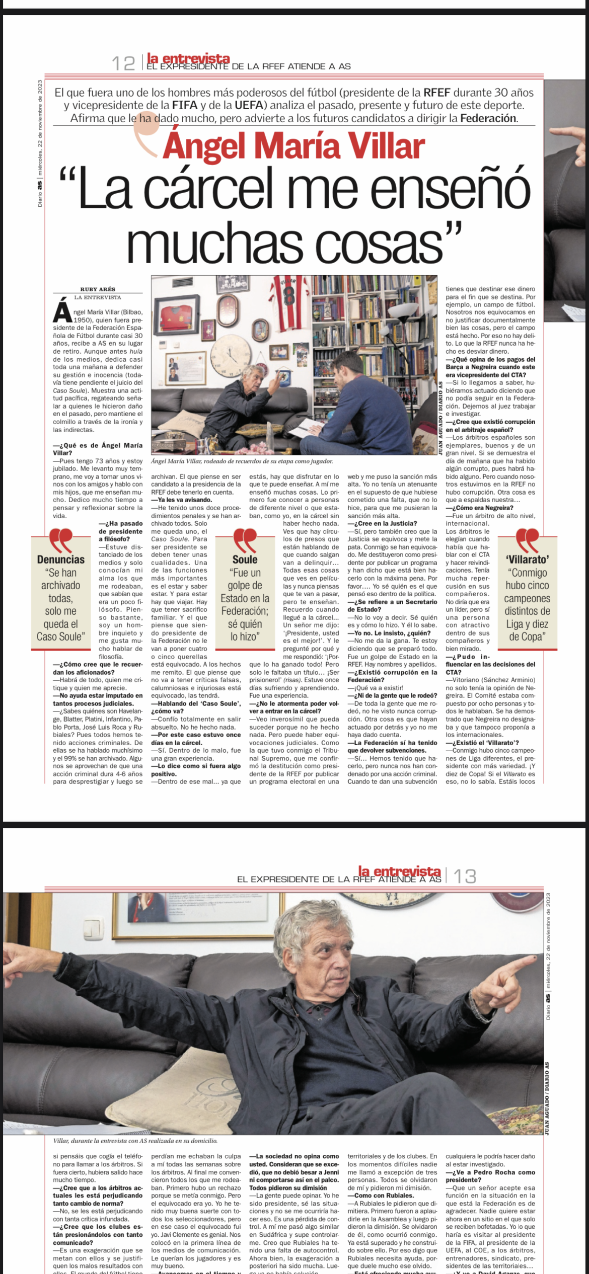 A continuación, en lugar de una respuesta, destacaremos una pregunta, asombrosa por parte del redactor. "¿Cree en la justicia?" Respondemos nosotros en nombre de Ángel Mari: "Nos ha jodido, como para no creer. Corrompe el fúrgol español durante 30 años y a cambio cumple once días de cárcel. ¿Dónde hay que firmar?"