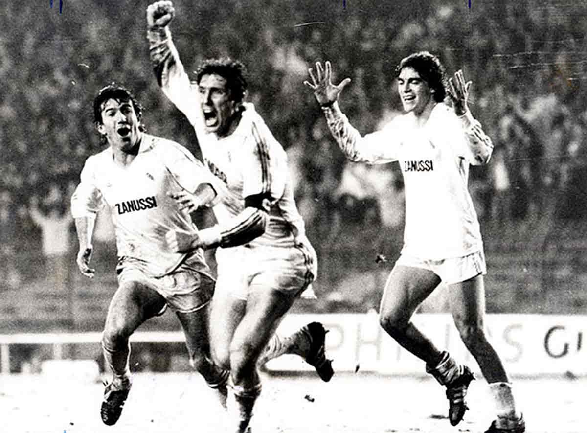 De ahí pasamos a la primera gran remontada europea, los octavos de final de la Copa de Europa, donde el Derby County nos pintó la cara en Londres con un tremendo 4-1, que fue enjugado en Madrid con aquel glorioso 5-1 de Pirri, Roberto Martínez y demás. Nos vamos a los octavos de final de la Copa de la UEFA, el Andelecht belga, equipo de moda en Europa, nos metió un 3-0 y, en la vuelta, se consagró un jovencísimo Emilio Butragueño al meterle tres golazos a Munaron para certificar el 6-1 que nos espoleaba a cuartos y al título. La temporada siguiente, en los octavos de la misma competición, el Borussia de Mönchengladbach, que nos metió un 5-1 sonrojarte en Alemania, que El Puma Santillana (Héctor del Mar dixit) se encargó de mandar al traste al marcar en el último minuto el 4-0 que nos hacía pasar a cuartos y a repetir título europeo.