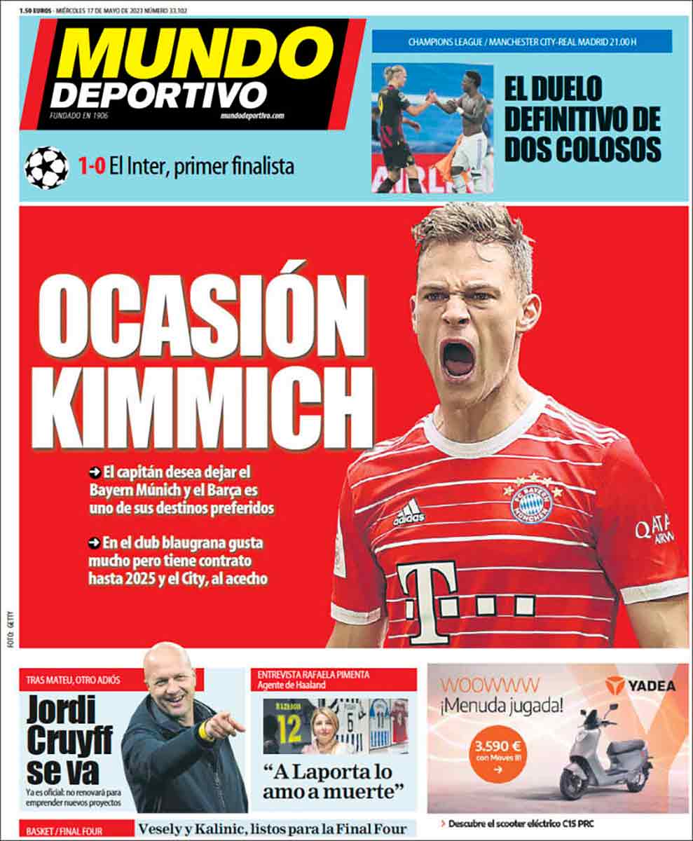 Mundo Deportivo pasa bastante del partido del Etihad (como si se pudiera) y habla de Kimmich como el próximo fichaje fantasioso del Negreira. Nos trae además una curiosidad que nos inflama. Love is in the air. Nos referimos a las palabras de la representante de Haaland: “A Laporta lo amo a muerte”. Es sabido que a Jan le gusta ser la pimienta de todos los asados, que Laporta es un potente euforizante que inhibe la recaptación de serotonina y dopamina en el cerebro culé y actúa de perfecto estimulante para sus acólitos, y con la señora Pimienta también ha surtido efecto esta personalidad arrolladora.