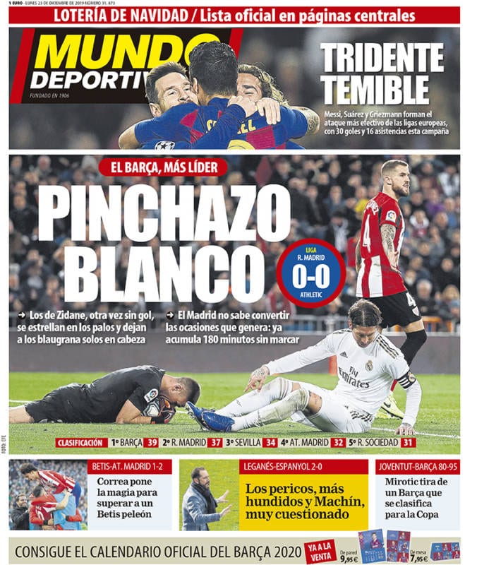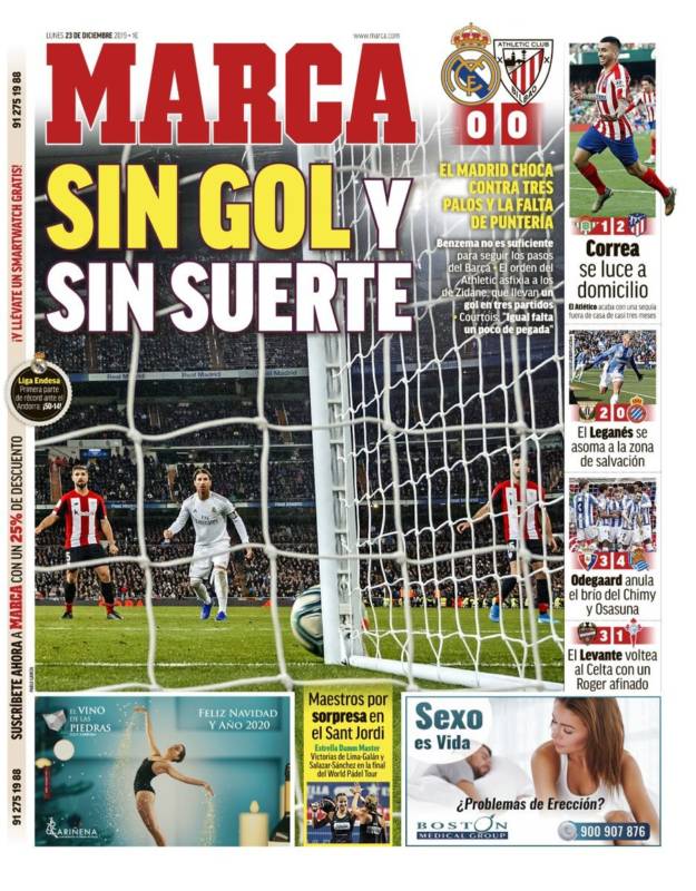 Buenos días. Acaba el año para el Real Madrid, y lo hace con el amargo sabor del infortunio. En un partido denodado ante un Athletic de Bilbao extraordinariamente defensivo, los de Zidane no lograron perforar la portería del excelente Unai, y la cosa acabó en un 0-0 que ya os contó Ramón Álvarez de Mon. Tres balones al palo resumen perfectamente la magnitud de la mala suerte que asoló a los blancos. Tiene gracia aludir a la suerte en el día en que algunos españoles se han convertido en millonarios gracias al giro aleatorio de un bombo mientras otros cuantos quedan a la espera de un giro en la veleta.