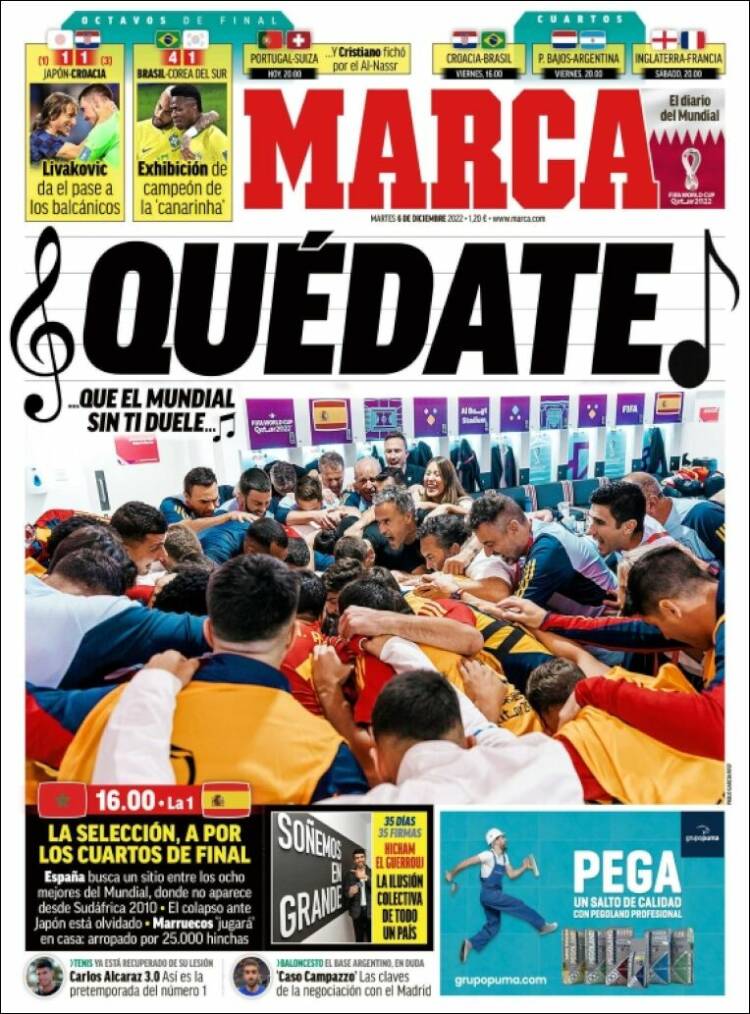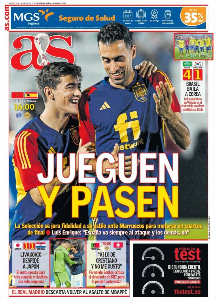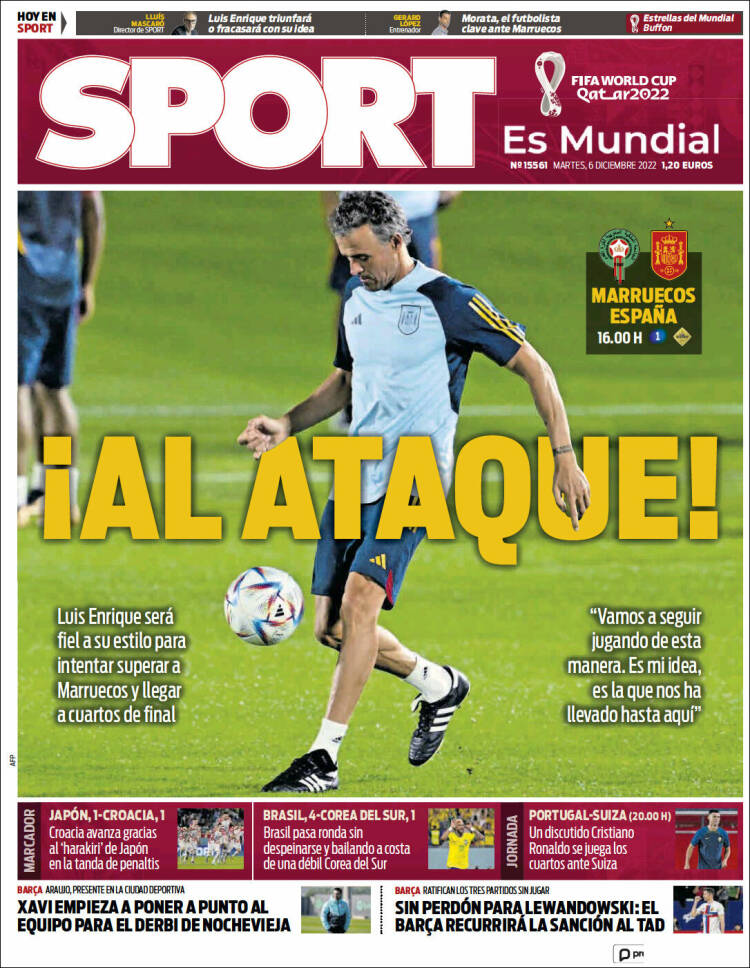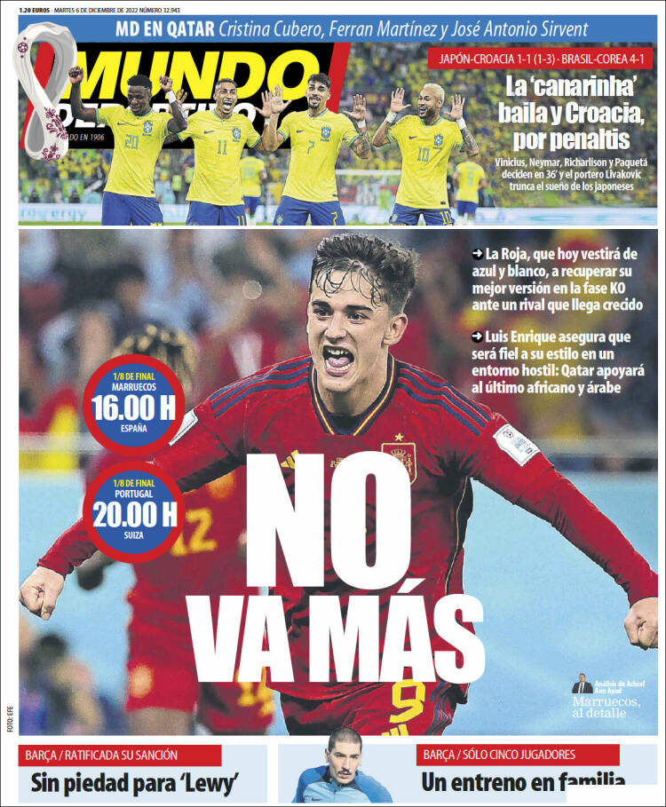 Sin embargo, el asunto crucial de la portada de Mundo Deportivo es la llamada roja (le quitamos la mayúscula a Mundial como modesta protesta ética, y le hemos quitado la mayúscula a Roja por puro aburrimiento), que hoy se la juega en octavos ante Marruecos. El elegido para presuntamente representar a ese equipo que presuntamente nos representa es Gavi. Antes casi de que podamos volver a preguntarnos con quién ha empatado este chaval, nos fijamos en que ocupa el mismo lugar de honor en As, si bien esta vez abrazado a Busquets, jugador este que, en cambio, y por muy discutible que nos resulte su deportividad, sí ha ganado unas cuantas cosas. Pero ¿qué pasa con Gavi? ¿Por qué tanta portada?