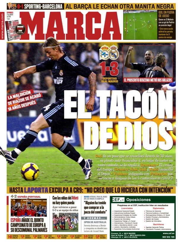 Igual se nota mucho que he dejado solos a mis dedos que me han traído hasta aquí. Ya van sin ruedines traseros y hemos llegado hasta el tacón de Dios, que es por lo que me sale Guti a saludar al final (probablemente, la del día después, la mejor portada de Marca de toda su historia: la más justa, la más bonita, la más elevada, la más contenida, como el gesto de Yves Montand), y porque aquello sucedió hace seis años por estas fechas, un treinta y uno de enero exactamente (me dice el Youtube), al que me adelanto para decir que habría que recordarlo cada año igual que Bill el Carnicero recordaba la muerte del sacerdote Vallon.