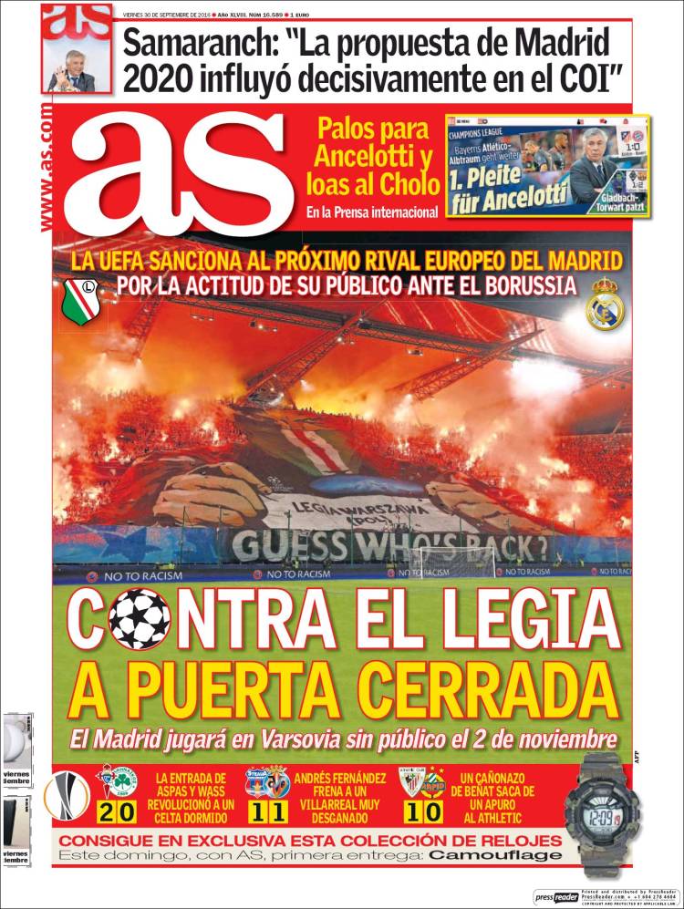 ... sobre todo si la comparamos con la flamígera primera plana de Ouija Today, donde de un tiempo a esta parte todo ultras, medianías y semifreaks tienen su espacio si con ello se puede erosionar a Florentino. Los cabestros que hoy nos ocupan son no obstante polacos del Legia, y la liaron parda. Tanto que jugarán contra el Madrid a puerta cerrada en la Champions.