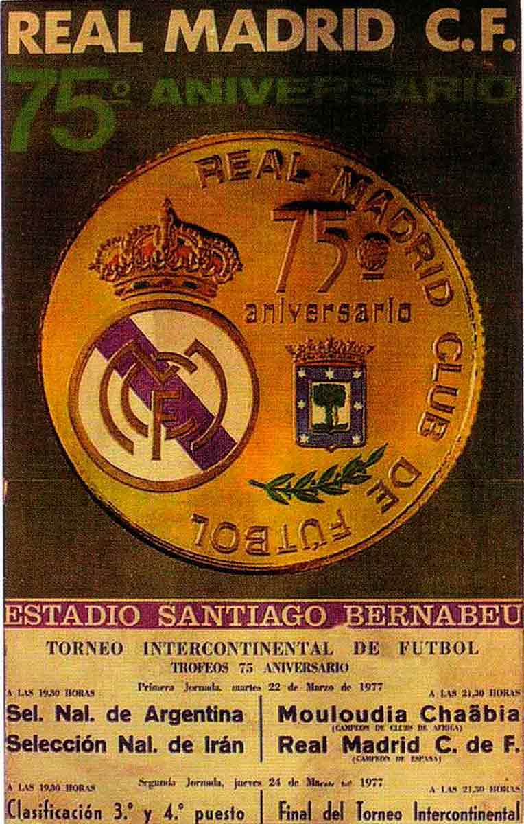 Ya poca gente se acordará del torneo que organizó el Real Madrid en 1977 para conmemorar el 75º aniversario de su existencia. Fue en el mes de marzo, con un formato cuadrangular, con dos semifinales y una gran final, y se denominó como “Torneo Intercontinental”, ya que participaron equipos y selecciones de 4 continentes distintos: la selección de Argentina, que iba a ser anfitriona en la Copa del Mundo del año siguiente, la selección de Irán, como campeona de la Copa Asiática de 1976 (tras derrotar a Kuwait por 1-0), el Mouloudia Chaàbia de Argel (hoy en día Mouloudia Club d’Alger), campeón de la Copa de África de clubs en 1976 (ganando al campeón de Guinea, el Hafia Conakry) y el propio Real Madrid C.F.