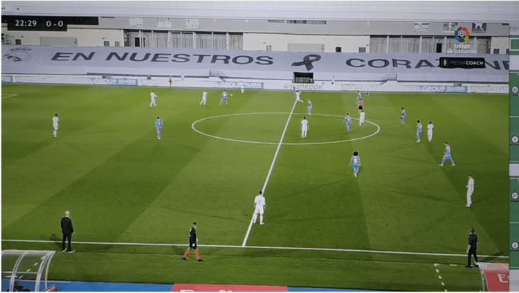 1. Carvajal por dentro. No es la primera vez que un entrenador mete al lateral por dentro, pero esto resulta especial. Que Marcelo (un genio de la pelota) o Mendy (una de sus características, ya lo hacía en Lyon) lo hicieran antes podría resultar hasta normal. Pero con Carvajal, no. ¿Qué se pretende con esto? En primer lugar, provocar un efecto dominó en el que Varane se abre casi a la posición de lateral derecho, lo que le permite contactar con el extremo e interior derecho, que hace la diagonal para fuera, evitando pérdidas conflictivas y dando tiempo y espacio para que Ramos juegue centrado, con tiempo, espacio y visión panorámica. Pero no sólo eso: cerrando a Carvajal se consigue fijar al centrocampista que sale a la presión, de manera que el interior del Madrid puede realizar un desmarque de distracción. Carvajal llama la atención del centrocampista rival, que tiene una preocupación extra y descuida el espacio a su espalda. Salió especialmente bien contra el Mallorca y frente al Getafe, movilizando a Maksimovic para desestructurar el sistema defensivo del equipo azulón.
