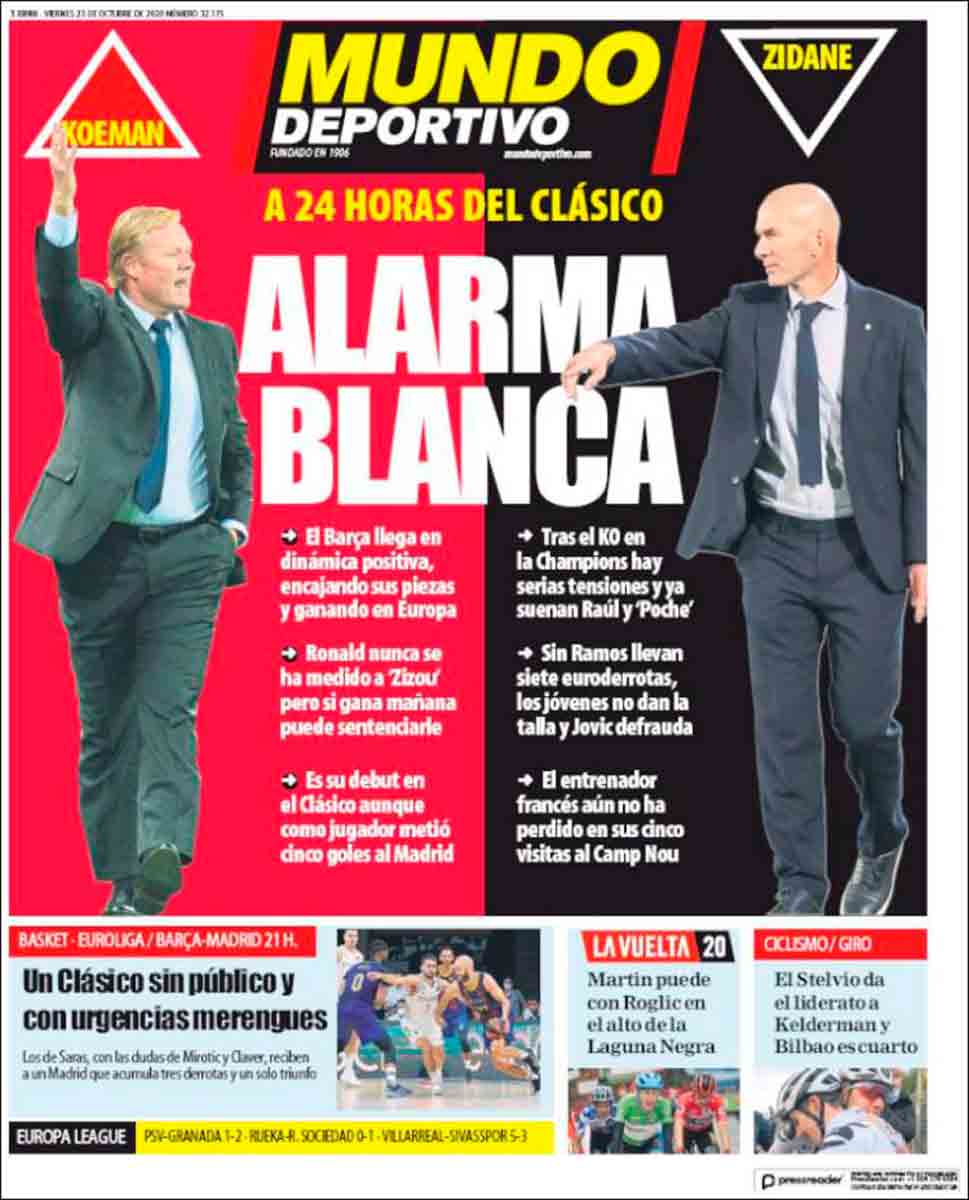 La portada aparece dividida en dos, una mitad para el Barça de Koeman, otra para el Madrid de Zidane, y adivinad a quién le toca la mitad de fondo negro. Este infantilismo lúgubre con que la prensa cataculé retrata los malos momentos del club al que odian nos produce regocijo. Son tan reconocibles, tan simples, que son nuestros en cierto modo. Hay algo entrañable en su contumacia en caer siempre en el mismo error, es decir, enterrar al Madrid antes de tiempo, una temeridad de la que el planeta (Mundo Deportivo incluido) debió salir escaldada cuando Tarantino hizo lo propio con Uma Thurman en Kill Bill 2. A ver si no van a tener que degustar su propia arrogancia como parte de la receta de calçots cuyos ingredientes detallamos.