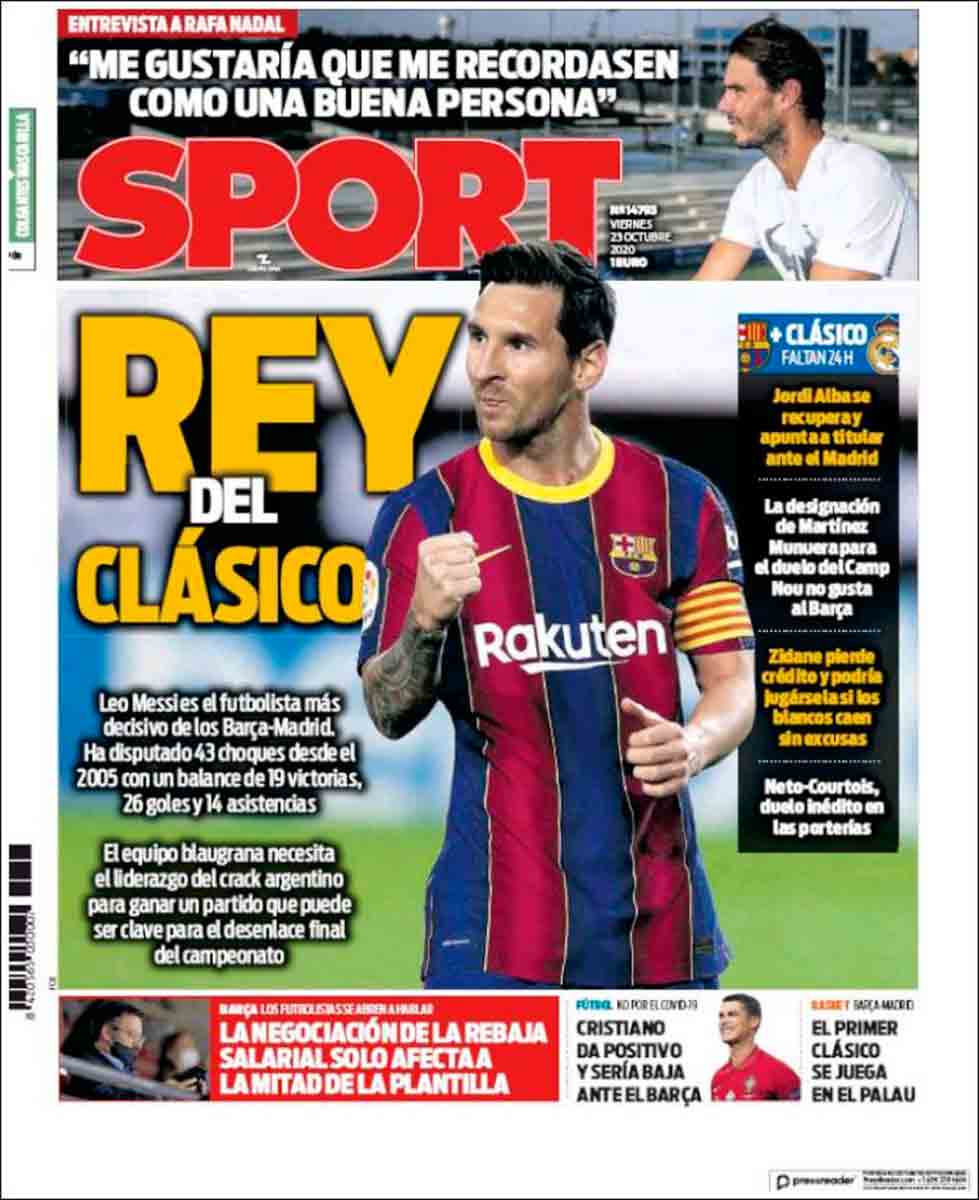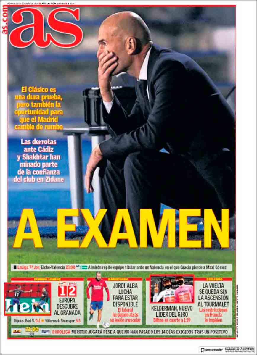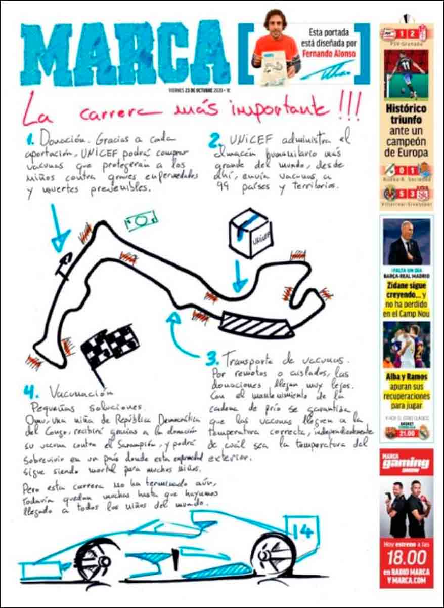 El resto de primeras planas del día son inanes y quizá por ello inocuas. Que si Messi es el rey del Clásico (¿cuántas veces hemos visto en portada este mismo monumento a la ramplonería más tópica?), que si Zidane pasa la enésima prueba. Marca, eso sí, aporta originalidad por una buena causa y ofrece su frontispicio a las cualidades pictóricas y explicativas de Fernando Alonso. Bien por Marca y Hala Madrid, que todo hay que decirlo en estos momentos aciagos, y quién sabe si el sábado por la noche no luciremos todos sonrisas restallantes que contrasten con la consternación dominante ahora. El Real Madrid, al fin y al cabo, consiste precisamente en esa grata sorpresa.