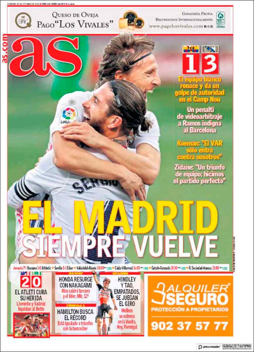 "El Madrid siempre vuelve". Pues sí. No precisamente gracias a ti, diario As, también conocido como Ouija Daily y eterno posicionador de piedrecitas en las ruedas, de puñeterías revestidas de falso señorío, de equidistancias piperiles. "Un penalti de videoarbitraje a Ramos indigna al Barcelona". Vaya. Pensábamos que el penalti había sido de Lenglet, pero parece ser que ha sido de Videoarbitraje. Definitivamente, tenemos que estar más atentos cuando vemos los partidos. Habríamos jurado que el que casi se lleva la camiseta de Sergio Ramos de recuerdo a casa (esos intercambios antes se hacían al final de los partidos) había sido Lenglet, pero si el penalti fue "de Videoarbitraje" se conoce que fue algún otro futbolista vestido de azulgrana, y de tan aparatoso nombre, quien cometió la infracción.
