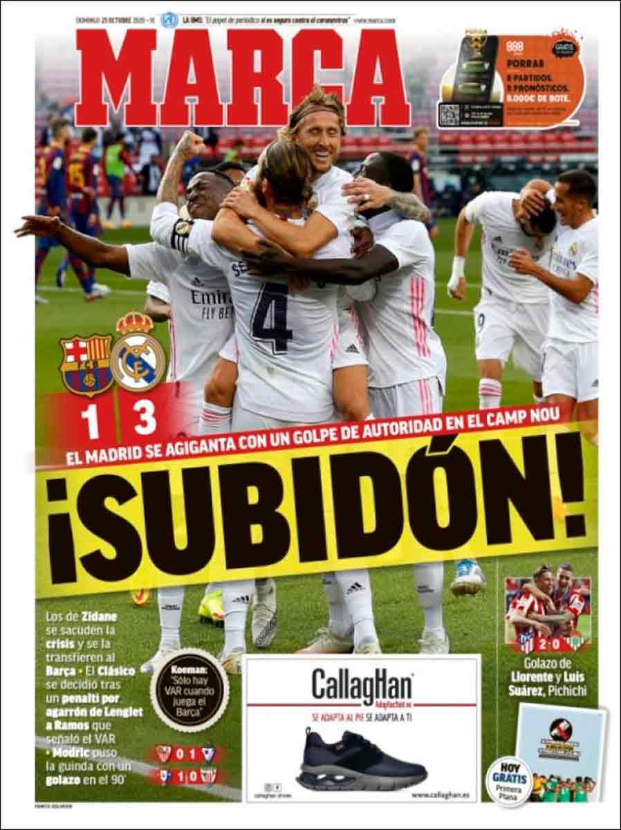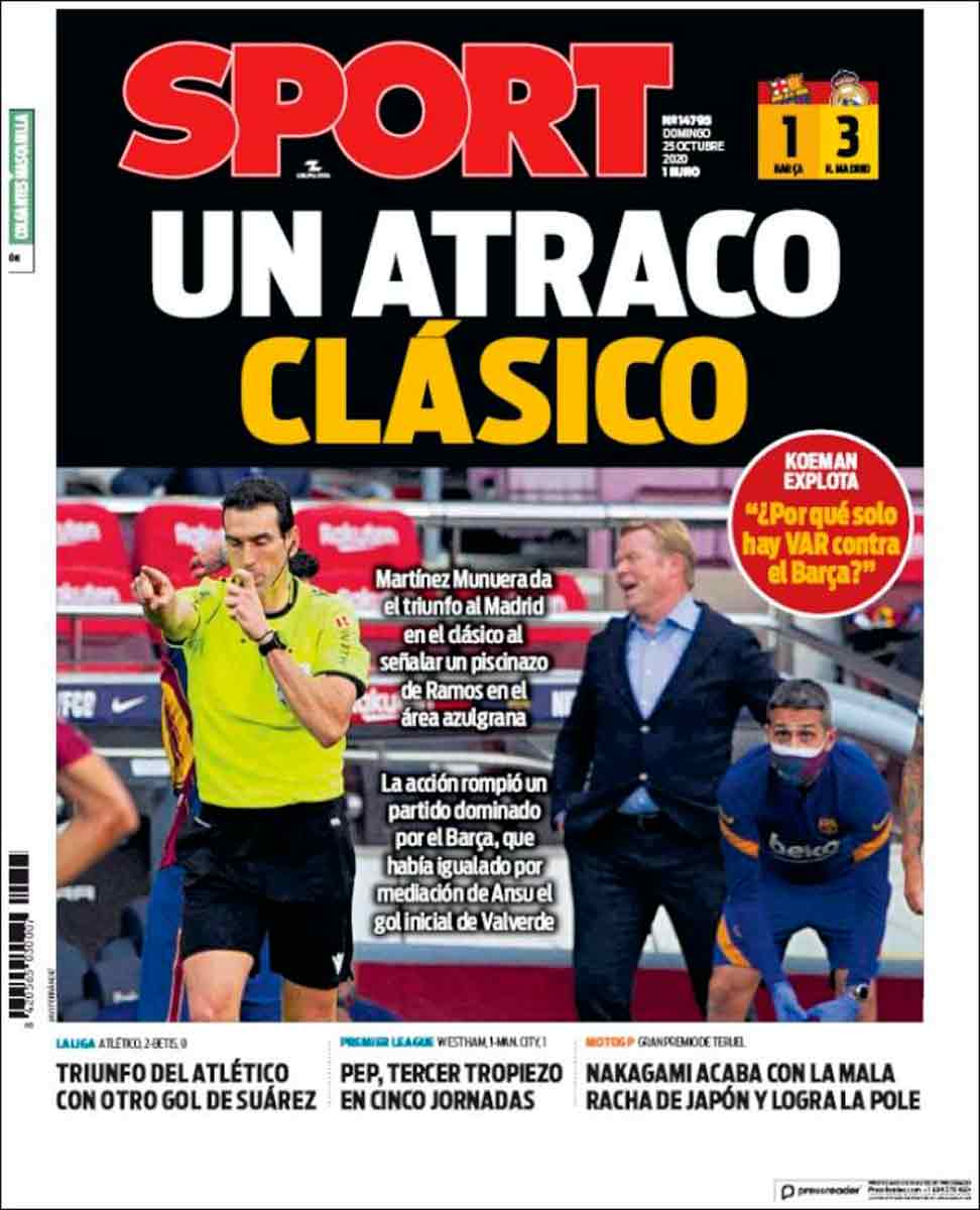 Esta portada, amigos, esta histórica portada es una carcajada a cinco columnas, claro, pero es también un verdadero hito de la posverdad. Miradla bien, porque va a ser difícil que os echéis a la cara un monumento más fehaciente y lapidario a la jeta más desenfadada y desacomplejada, de igual modo que es complicado que Sport logre superar en su larga historia de falta de pudor una cúspide del caradurismo como la que esto representa. Cada detalle es una verdadera maravilla, un motivo de hilaridad insuperable en un conjunto artístico digno del más prestigioso museo de la infamia. "Un atraco clásico". "Martínez Munuera da el triunfo al Madrid" pero no lo hace de cualquier manera, no, sino señalando penalti "en un piscinazo" de Ramos. Nos sulibeya especialmente lo de "la acción rompió un partido dominado por el Barça", aseveración que será estudiada en las academias como ejemplo de la transversalidad entre la posverdad arbitral y la posverdad futbolística.