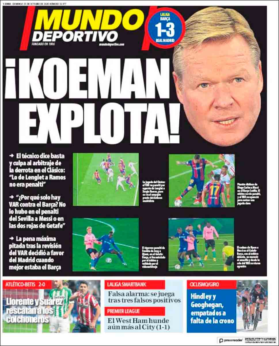 Lo triste es, que al preguntar a Koeman por el partido y soltarnos el discurso llorón y ochentero del victimismo culé, y decir que su equipo ha "jugado fenomenal", no hay ningún sólo periodista que se atreva a preguntar por los 13 años de penaltis no pitados en Barcelona, o la cantidad de veces que estos mismos años el Madrid ha terminado el clásico con 10, o por la condescendencia hacia Messi, al que solamente un soplido basta para que al rival se le pite falta o amarilla correspondiente.