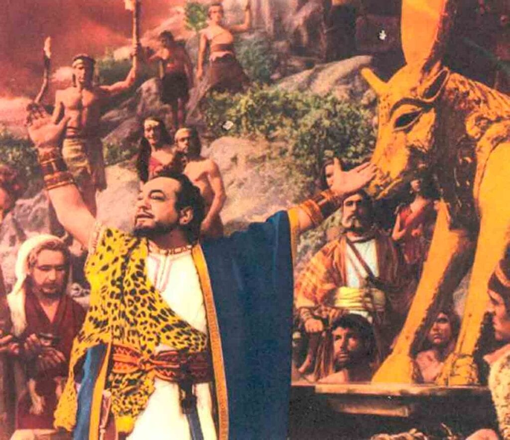 De este modo, gran parte de los otrora esclavos, encabezados por el perverso Dathan (enorme, como siempre, Edward G. Robinson), logra amotinar a una gran parte de los judíos en contra de Moisés, prometiéndoles paz y tranquilidad y perdón de sus enemigos si regresan a Egipto, adorando una estatua de su dios Apis, un becerro de oro fabricado con las joyas de todo el pueblo oprimido.