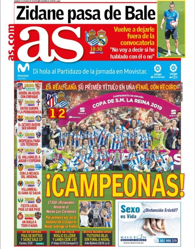 PD: Felicidades a las chicas de la Real Sociedad por el triunfo en la final de la Copa de la Reina. Es una estupenda noticia que el fútbol femenino siga creciendo y cada vez sea más común ver a las futbolistas en las primeras páginas.
