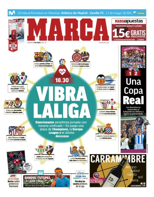 Nosotros pensamos, sin embargo, que Zidane está volviendo locos a los periodistas. Ya no saben si uno juega porque va a seguir, si lo hace porque hay anticiclón, si tiene minutos porque es día par o si se ha colado en el once porque la primavera la sangre altera. Quizá por eso 'Marca' decide no meterse en el mismo jardín que 'AS' y luce una portada que se centra en la eléctrica penúltima jornada de la Liga.
