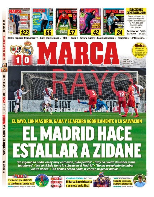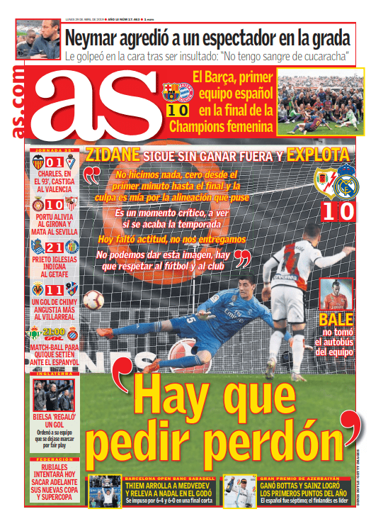 La prensa se hace eco de las palabras de Zidane. No podemos poner ni un pero a las portadas de hoy. De hecho, son bastante suaves para lo que podían haber sido, aunque, bien visto, lucir las declaraciones del entrenador del Real Madrid ya envuelve todo de una dureza necesaria e imposible de ocultar. Zidane fue tan claro que no caben medias tintas. Sintió el hastío y el agotamiento emocional en sus propias carnes. Se empapó de madridismo en noventa minutos extremadamente dolorosos. Y pidió perdón. Porque sabe que el Real Madrid no puede perder así y porque la gente, por mucho que la temporada esté acabada y haya sido un fracaso, sigue sufriendo.