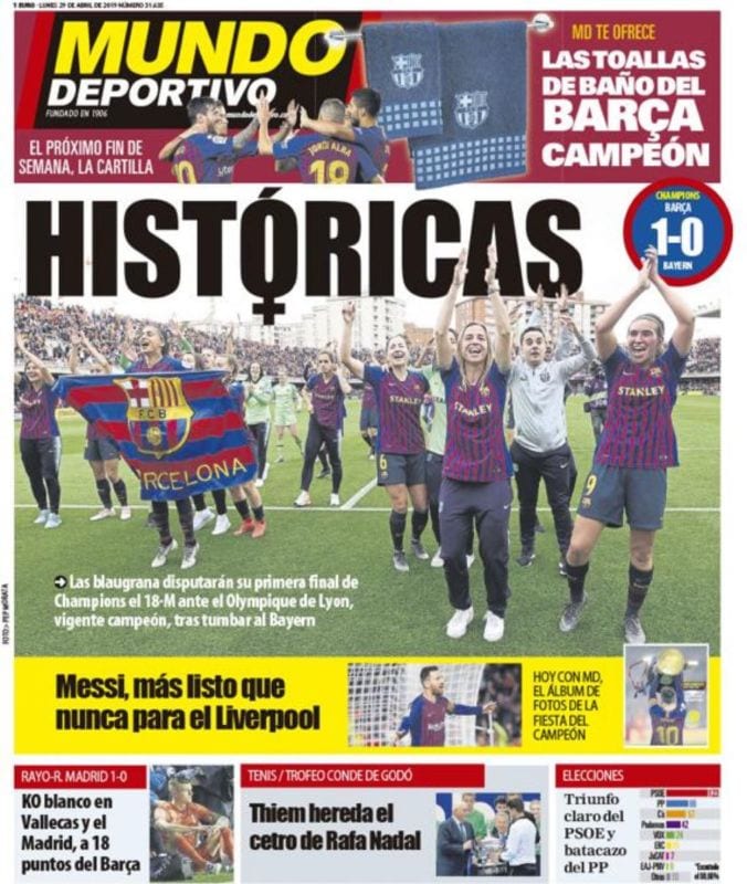 En Barcelona, mientras tanto, celebran el éxito de la sección de fútbol femenino, que ha logrado meterse en la final de la Champions League. Os dejamos las portadas por si queréis verlas.